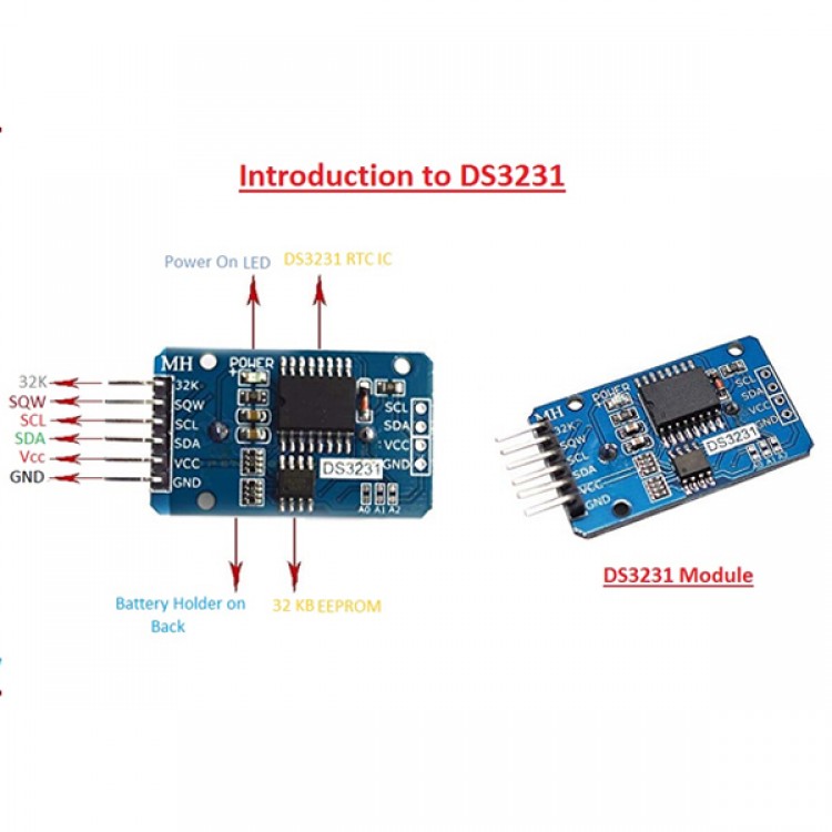 It also has a built in comparator which monitors the status of VCC to detect power failures and to automatically switch to backup power supply. AT24C32 provides 32,768 bits of serial EEPROM organized as 4096 words of 8 bits each. This gives you 32Kb of non-volatile memory for your projects. This module can be easily interfaced with Arduino Boards, Raspberry Pi and all Microcontrollers.
