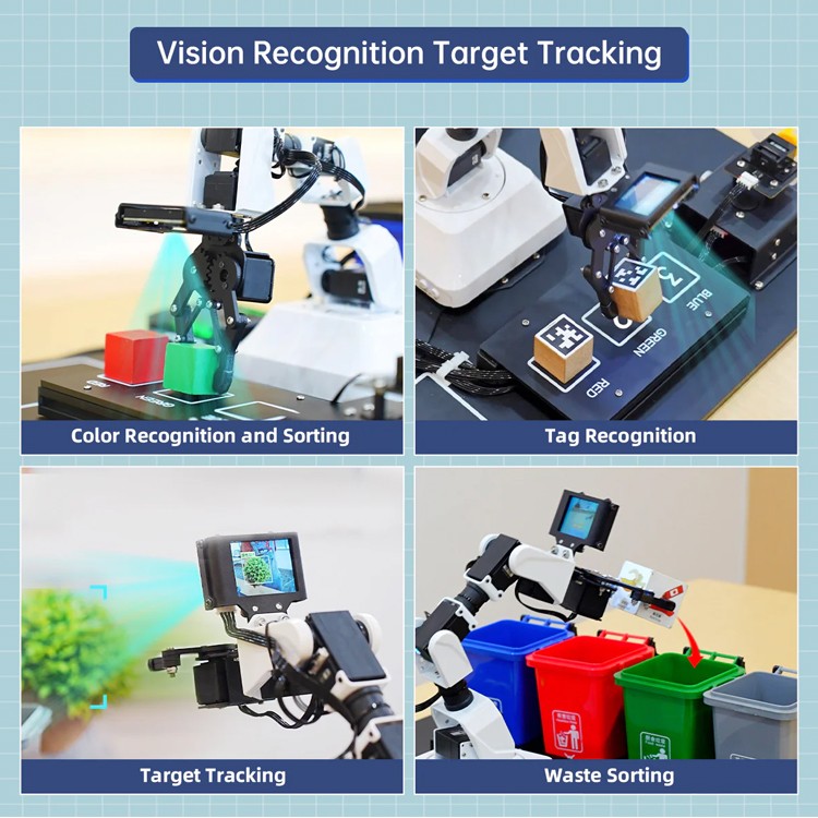 - 【AI Vision Recognition and Tracking】AiArm combines the WonderCam AI vision module to recognize and locate target objects, enabling the implementation of AI applications like color sorting and waste sorting.